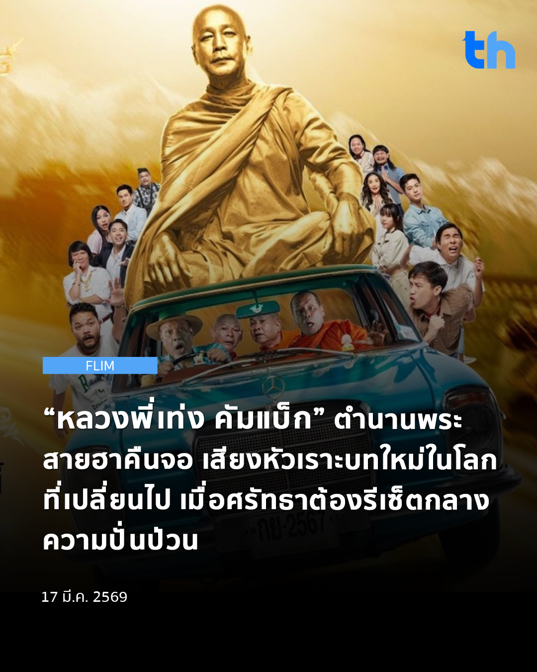 ติดตามชมมูฟวี่พรีเมียร์ “หลวงพี่เท่ง คัมแบ็ก” ได้ในวันอาทิตย์ที่ 22 มีนาคม 2569 เวลา 21.00 น. ทางทรูโฟร์ยู ช่อง 24 และชมสดออนไลน์ได้ที่เว็บไซต์ true4u.com