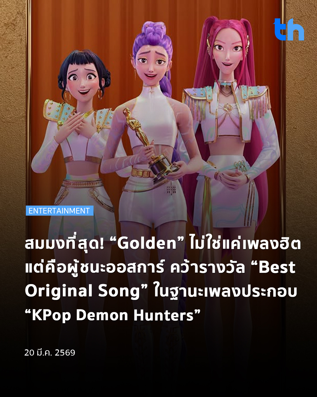 ในที่สุด “Golden” เพลงประกอบแอนิเมชันเรื่องดัง “KPop Demon Hunters” จาก Netflix ก็สามารถคว้ารางวัลใหญ่อย่าง “Best Original Song” จากเวที “ออสการ์ 2026” เมื่อคืนวันที่ 15 มีนาคม 2026 ที่ผ่านมาได้อย่างสวยงามแบบไม่พลิกโผ โดย “Golden” เป็นเพลง K-Pop เพลงแรกที่ได้รางวัลออสการ์ รวมถึงตัวภาพยนตร์เรื่องนี้ก็ได้รางวัล “Best Animated Feature Film” ไปครองอีกด้วย เรียกได้ว่าสมมงทั้งภาพยนตร์และเพลงประกอบกันเลยทีเดียว