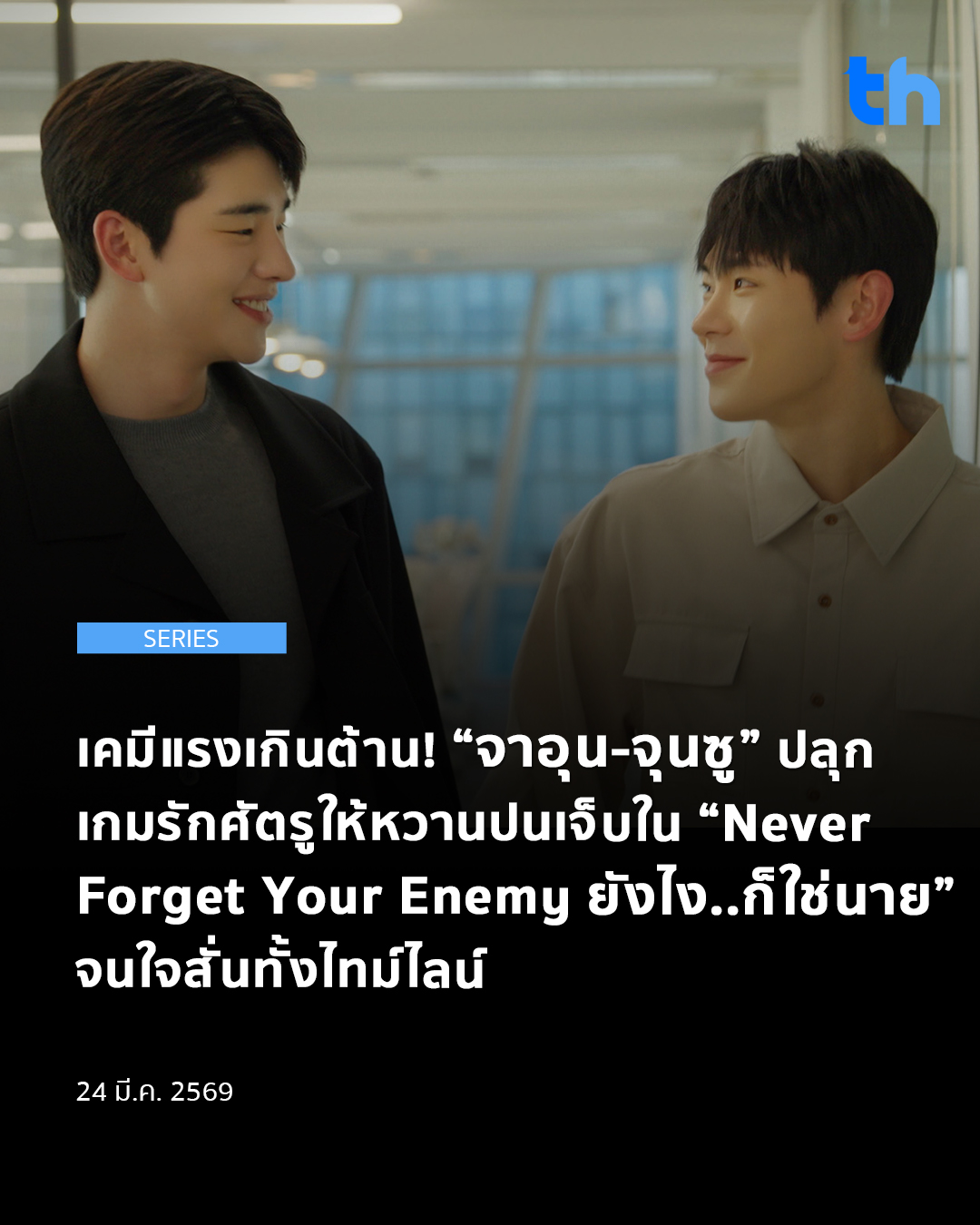 ทำเอาแฟน ๆ ยิ้มกว้าง ฟินกันถ้วนหน้าสมการรอคอย สำหรับซีรีส์วายจาก WeTV Original “Never Forget Your Enemy ยังไง..ก็ใช่นาย” ที่ได้สองนักแสดงดาวรุ่ง “ลีจาอุน” และ “ฮวังจุนซู” มาถ่ายทอดเรื่องราวความรักของหนุ่มความจำเสื่อมที่ต้องมารื้อฟื้นอดีตผ่านศัตรูที่อ้างว่าเป็นคนรัก ด้วยพล็อตสุดเข้มข้นผสานโมเมนต์ชวนใจสั่น ทำให้ซีรีส์กวาดกระแสตอบรับจากแฟน ๆ อย่างถล่มทลาย จนทะยานขึ้นลิสต์ซีรีส์มาแรงที่ต้องดูบนแอป WeTV พร้อมเสียงชื่นชมถึงเคมีที่ลงตัวและเสน่ห์ครองใจคนทั้งโซเชียล
