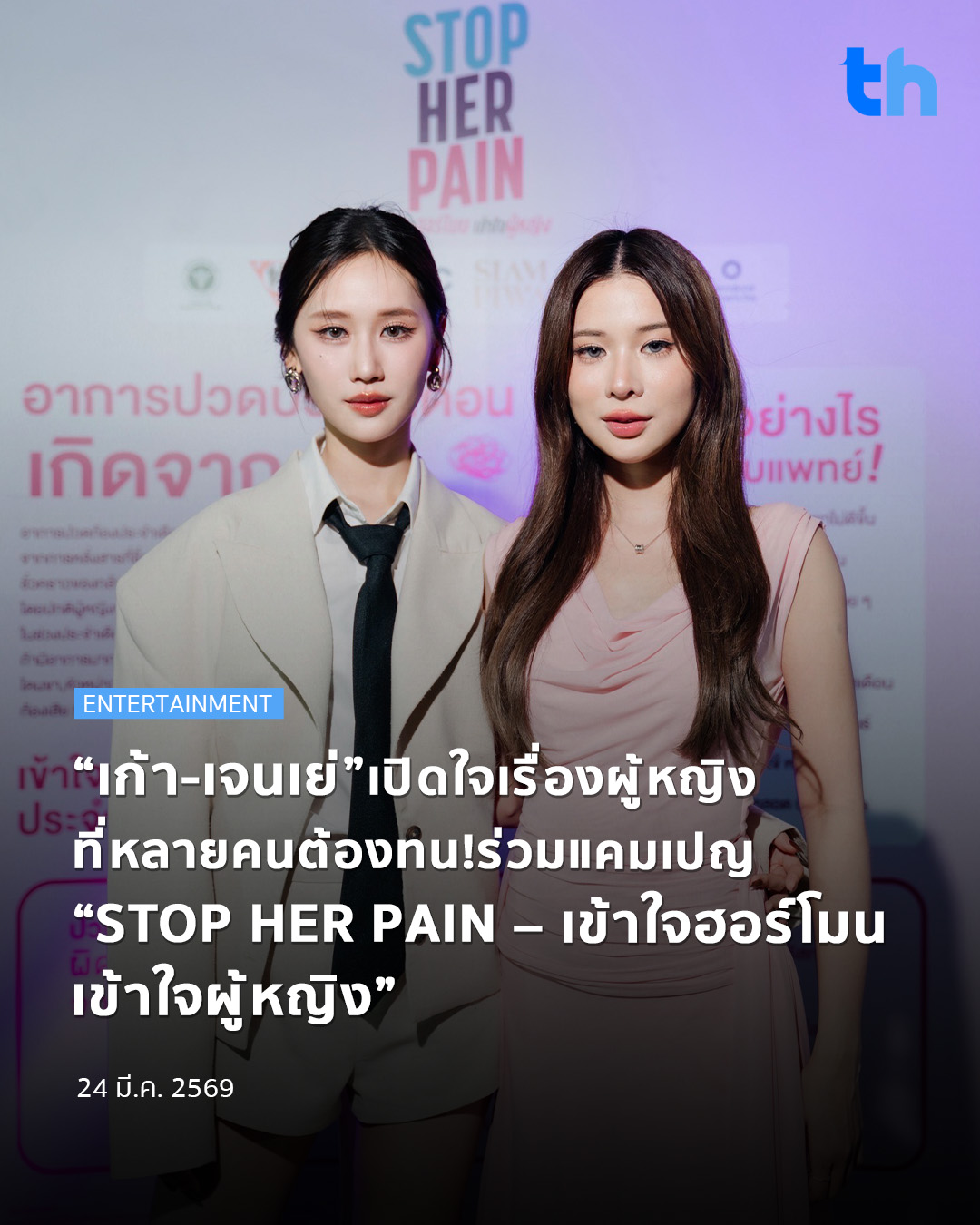 ด้าน เจนเย่ กล่าวเสริมว่า “วันนี้เราสองคนดีใจที่มีโอกาสมาร่วมเป็นส่วนหนึ่งของแคมเปญ ‘STOP HER PAIN – เข้าใจฮอร์โมน เข้าใจผู้หญิง’ โดยเฉพาะเรื่องฮอร์โมนและอาการปวดประจำเดือน ซึ่งส่งผลต่อชีวิตประจำวันมากกว่าที่หลายคนคิดค่ะ อีกทั้งยังเป็นการเน้นย้ำความสำคัญของเดือนแห่งวันสตรีสากลอีกด้วย เราสองคนขอเป็นตัวแทนผู้หญิงรุ่นใหม่ที่กล้าออกมาพูดเรื่องสุขภาพของตัวเองอย่างเปิดเผยค่ะ”