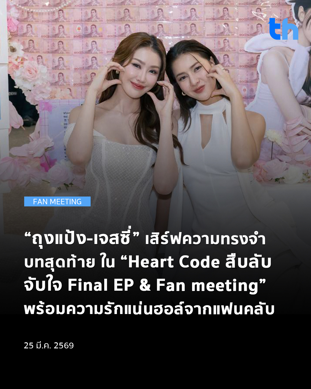 ถุงแป้ง-ภัทรวดี เหลาสา และ เจสซี่-ณัฐศิญา พรหมมาตร” จากซีรีส์แนวสืบสวนสอบสวนกระแสแรง Heart Code สืบลับจับใจ” ได้จัดงาน Heart Code สืบลับจับใจ Final EP & Fan meeting” ณ Lido Connect ชวนแฟนคลับผู้โชคดีทั้งไทยและอินเตอร์แฟน ร่วมบันทึกความทรงจำบทสุดท้ายของซีรีส์ท่ามกลางโมเมนต์สุดประทับใจที่ทำเอานักแสดงและแฟนคลับกลั้นน้ำตาไว้ไม่อยู่