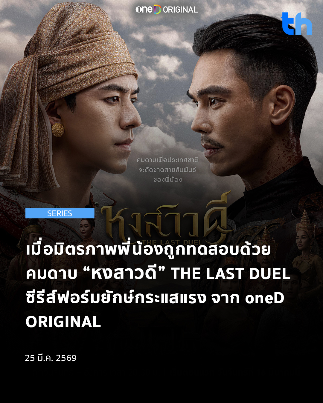 “หงสาวดี” THE LAST DUEL ซีรีส์ฟอร์มยักษ์เรื่องแรกของปี 2026 จาก “oneD ORIGINAL” ที่ได้แรงบันดาลใจจากประวัติศาสตร์ ไทย-พม่า สงครามยุทธหัตถีระหว่างสองแผ่นดินที่ยิ่งใหญ่ที่สุด ระหว่าง “อโยธยา” และ “หงสาวดี”