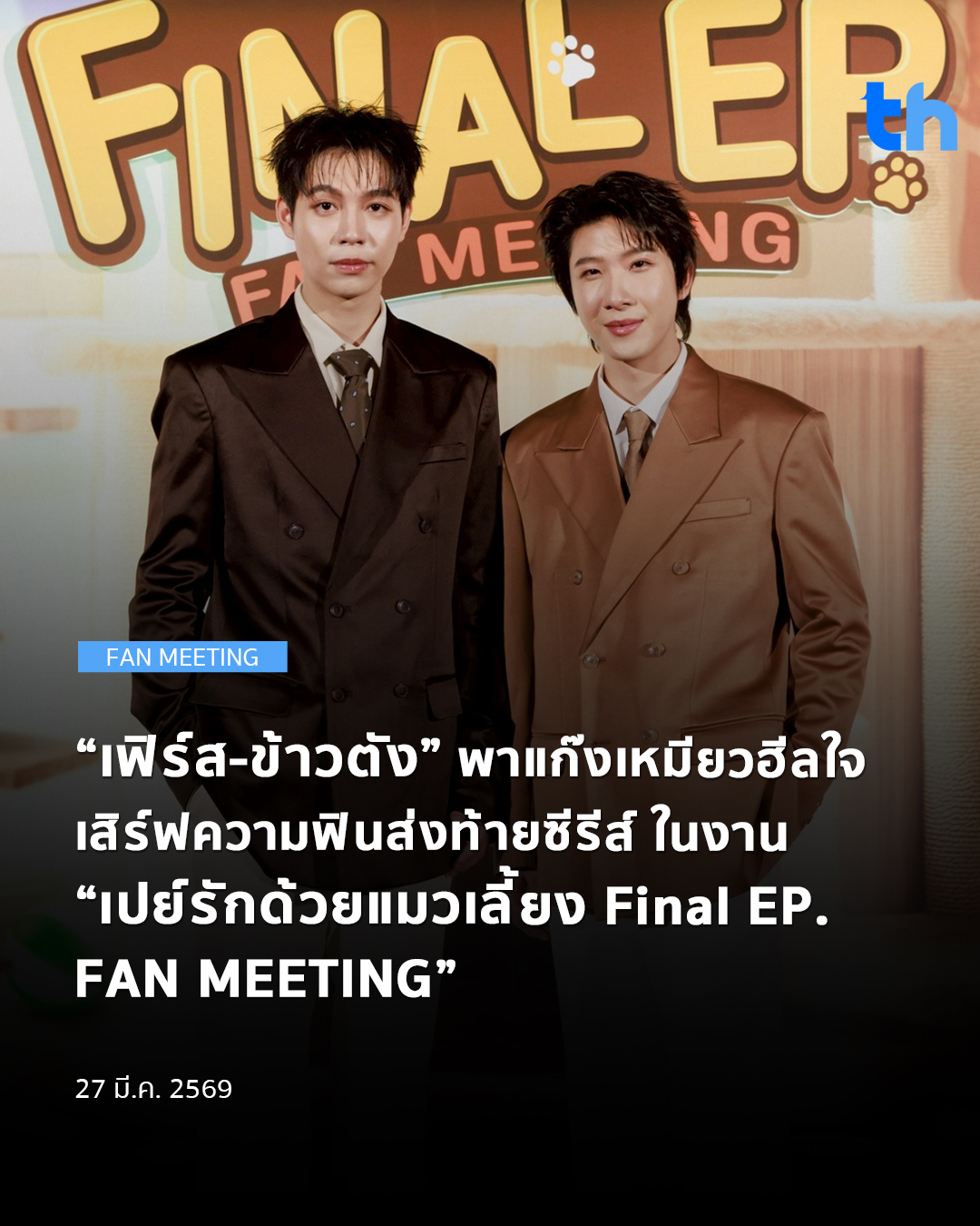 ล่าสุดงาน “เปย์รักด้วยแมวเลี้ยง Final EP. FAN MEETING” ก็ได้เสียงตอบรับล้นหลามจากแฟน ๆ ทำให้บัตร SOLD OUT ทุกที่นั่ง ตอกย้ำความฮอตเกินต้านจากแฟน ๆ ทั่วโลก งานนี้ “เฟิร์ส-ข้าวตัง” หอบเคมีสุดเฮลตี้กอดคอเพื่อน ๆ แก๊งเหมียว “สตางค์ กิตติภพ เสรีวิชยสวัสดิ์, เกรท สพล อัศวมั่นคง, เจเจ ชยกร จุฑามาศ” พร้อมใจกันบอกรักทาสแมวเสิร์ฟความฟินกับบทสรุปซีรีส์ “เปย์รักด้วยแมวเลี้ยง” รับชมตอนสุดท้ายด้วยกัน และพูดคุยแบบเอ็กซ์คลูซีฟ ทั้งยังมีโชว์สุดพิเศษจากเหล่า นักแสดง พิเศษร่วมด้วยผู้กำกับฯ คนเก่ง “พี่อู๋ กรพรหม นิยมศิลป์” ที่มาพูดคุยถึงเบื้องหน้าเบื้องหลังการทำงาน เมื่อวันอังคารที่ 24 มีนาคม 2569 เวลา 19.30 น. ที่ ชั้น 6 สยามพารากอน โรงภาพยนตร์สยามภาวลัย Paragon Cineplex