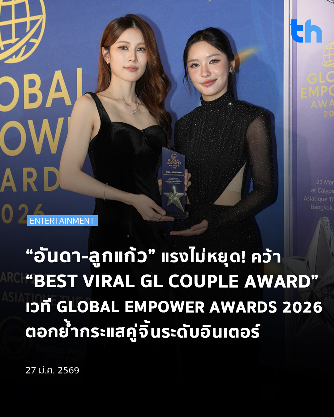 “อันดา-ลูกแก้ว” แรงไม่หยุด! คว้า “BEST VIRAL GL COUPLE AWARD” เวที GLOBAL EMPOWER AWARDS 2026 ตอกย้ำกระแสคู่จิ้นระดับอินเตอร์