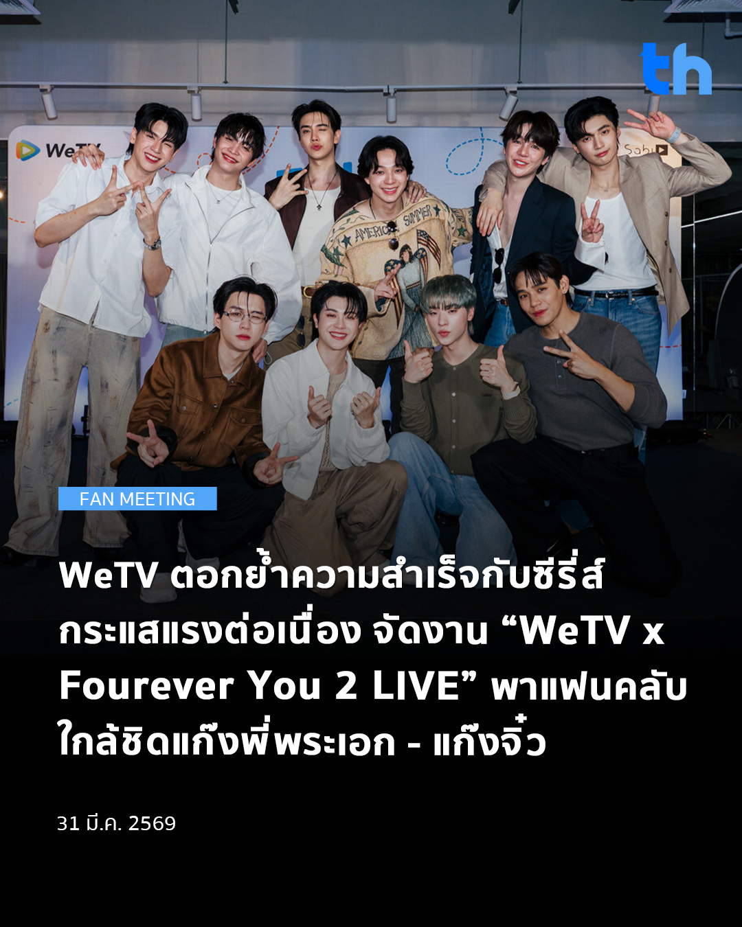 WeTV แพลตฟอร์มวิดีโอสตรีมมิงที่รวมสุดยอดความบันเทิงคุณภาพแห่งเอเชีย ตอกย้ำความฮิตถล่มทลายของโปรเจกต์ซีรีส์จากบ้าน “Studio Wabi Sabi” อย่าง “Fourever You Part 2” หลังได้รับกระแสตอบรับอย่างล้นหลามจากแฟนคลับทั้งในประเทศไทยและต่างประเทศ ล่าสุดได้จัดงาน “WeTV x Fourever You 2 LIVE” มอบโมเมนต์สุดพิเศษให้แฟนคลับได้ใกล้ชิดนักแสดงนำทั้ง 10 คนจากซีรีส์ ได้แก่ “บีเวอร์ พรรษพล เจนสรรพกิจกุล, ต้นหลิว เมธาพัฒน์ ฉิมกุล, เงิน อนุภาษ เหลืองสดใส, โอ๊ต ธาราธร พุ่มโพธิงาม, พาย ศรัณวุฒิ นิตยสุทธิ, กอล์ฟ พสธร เลิศสถิตย์วงศ์, ปอนด์ พลวิชญ์ เกตุประภากร, เอิร์ธ กัษมนณัฏฐ์ นามวิโรจน์, แม็กกี้ รชต พิเชฐโชติ และ บาส หัสณัฐ พินิวัตร์” ที่ได้จัดขึ้นเมื่อวันที่ 24 มีนาคม 2569 ที่ผ่านมา ณ UNION MALL ชั้น 5, UNION CO-EVENT STUDIO ท่ามกลางแฟนคลับที่มาร่วมงานอย่างคับคั่ง