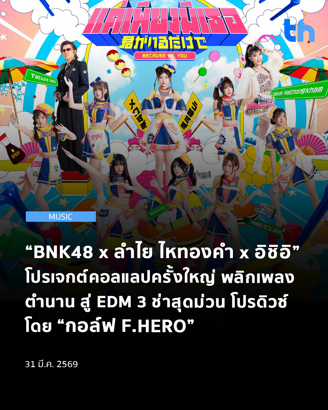 “แค่เพียงมีเธอ” Kimi ga Iru Dake de อ่านว่า คิมิ กะ อิรุ ดะเคเดะ เป็นโปรเจกต์ Collaboration ยิ่งใหญ่ “BNK48 × ลำไย ไหทองคำ ×Tatuya Ishii (ทัตสึยะ อิชิอิ)” ศิลปิน J-Pop ระดับตำนาน จากเพลงฮิต “Kimi ga Iru dake de” ที่นำกลับมาทำใหม่ให้สนุกในสไตล์ EDM 3 ช่า REMIX แบบไทย ๆ ต้อนรับเทศกาลสงกรานต์ที่ได้ Executive Producer อย่าง “F.HERO” มาร่วมงาน นอกจากจะได้ฟังบทเพลงและท่วงทำนองที่คิดถึงแล้ว ยังเพิ่มเติมรสชาติความเป็นไทย สนุกสนานม่วนจอย พร้อมความแปลกใหม่ด้วยเช่นกัน ทั้งหมดนี้เชื่อมเข้าด้วยกันอย่างกลมกลืนแบบอัพเกรดกว่าเดิม โดยจะมีการแสดงเปิดตัวอย่างเป็นทางการในวันที่ 13 เมษายน 2569 และในงาน Thai Festival Tokyo 2026 ในเดือนพฤษภาคมนี้