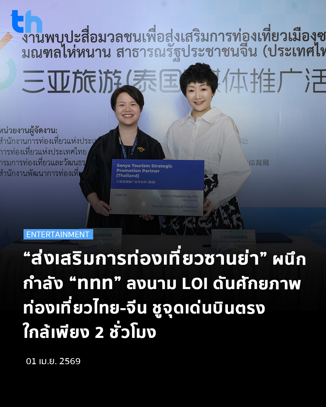 เมื่อวันที่ 31 มีนาคม 2569 “สำนักงานส่งเสริมและพัฒนาการท่องเที่ยวเมืองซานย่า” ร่วมกับ การท่องเที่ยวแห่งประเทศไทย” จัดพิธีลงนามหนังสือแสดงเจตจำนงความร่วมมือ (LOI) ณ ศูนย์วัฒนธรรมแห่งประเทศจีน กรุงเทพฯ โดยทั้งสองฝ่ายมีเป้าหมายยกระดับความร่วมมือด้านการส่งเสริมการท่องเที่ยว การพัฒนาผลิตภัณฑ์ และการเชื่อมโยงตลาด เพื่อกระตุ้นการเดินทางของนักท่องเที่ยวระหว่างสองพื้นที่ให้เพิ่มมากขึ้น