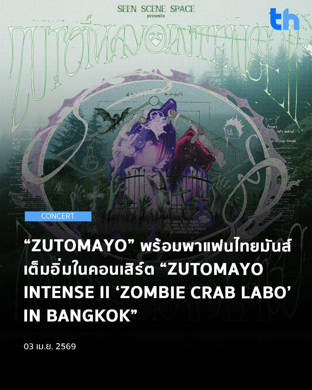 วง J-Pop / Rock-Alternative ชื่อดัง “ZUTOMAYO” เตรียมส่งตรงความมันส์ถึงแฟนเพลงไทยใน คอนเสิร์ต “ZUTOMAYO INTENSE II ‘ZOMBIE CRAB LABO’ IN BANGKOK” วันที่ 2 พฤษภาคมนี้ ที่ Union Hall จัดโดย Seen Scene Space หลังจากที่พวกเขาประสบความสำเร็จอย่างสูงกับทัวร์คอนเสิร์ต MIDNIGHT FOREVER EXPO ‘MEIKŌ WA GUNARUGA GOTOSHI’ ที่เมืองโอซาก้า เมื่อปี 2025