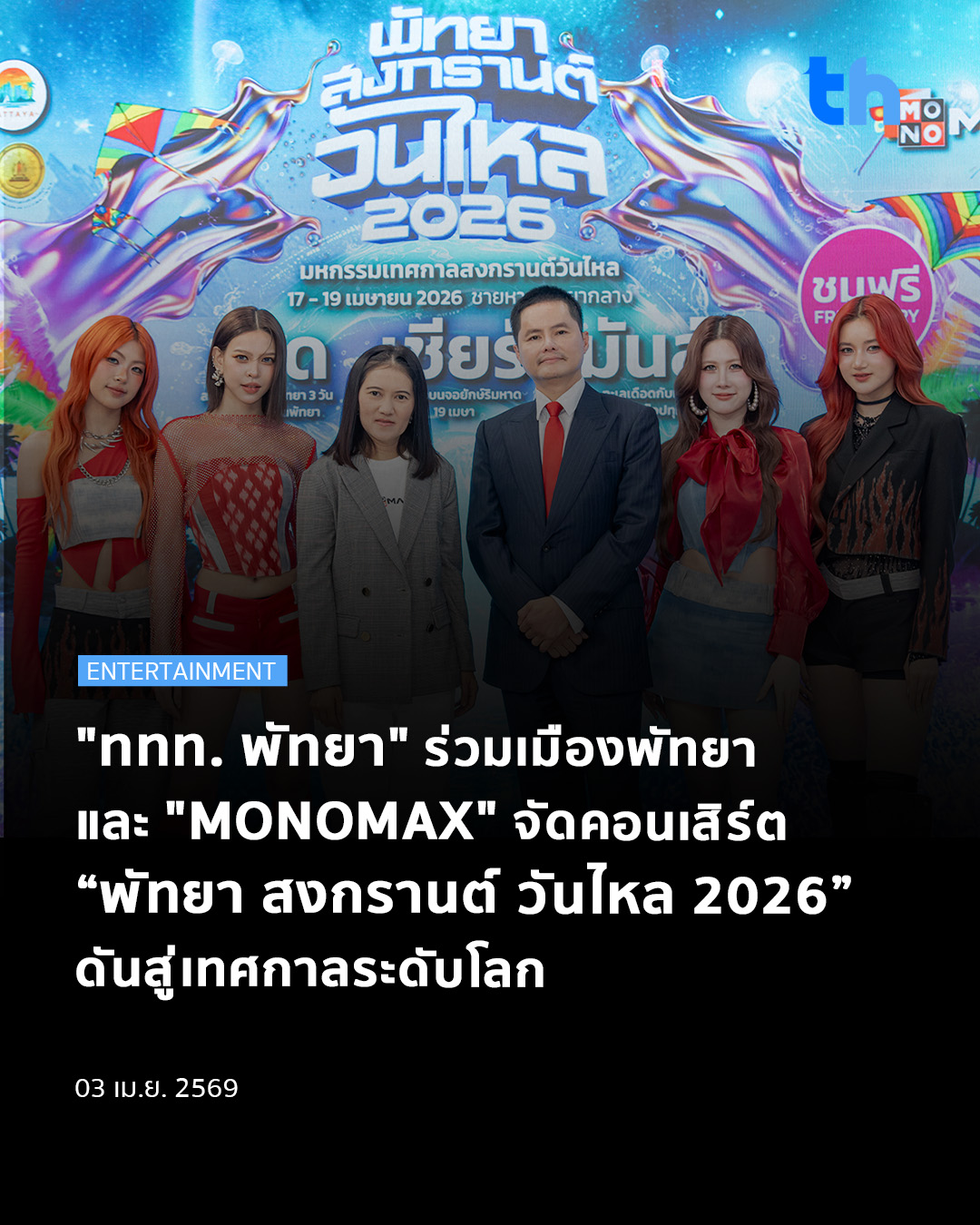 ขณะที่ คุณหทัยทิพย์ หมัดจุ้ย ผู้อำนวยการธุรกิจ Monomax บริษัท โมโนสตรีมมิ่ง จำกัด กล่าวว่า “การจัดงานในครั้งนี้มุ่งเน้นการสร้างประสบการณ์ความบันเทิงรูปแบบใหม่ที่ผสานดนตรี กีฬา และวัฒนธรรมเข้าด้วยกันอย่างกลมกลืน เพื่อตอบโจทย์พฤติกรรมนักท่องเที่ยวยุคใหม่ที่ต้องการประสบการณ์หลากหลายในพื้นที่เดียวกัน นอกจากคอนเสิร์ตจากศิลปินแถวหน้าของเมืองไทยแล้ว เรายังมีไฮไลต์การถ่ายทอดสดการแข่งขันฟุตบอล Premier League ริมชายหาด ซึ่งถือเป็นการนำเสนอคอนเทนต์กีฬาระดับโลกควบคู่ไปกับบรรยากาศเทศกาลไทยได้อย่างโดดเด่น และสะท้อนถึงศักยภาพของประเทศไทยในการพัฒนาอีเวนต์เชิงสร้างสรรค์สู่ระดับนานาชาติ ทั้งยังมีส่วนสำคัญในการส่งเสริมภาพลักษณ์ของเทศกาลสงกรานต์ไทยให้เป็นที่รู้จักและยั่งยืน”