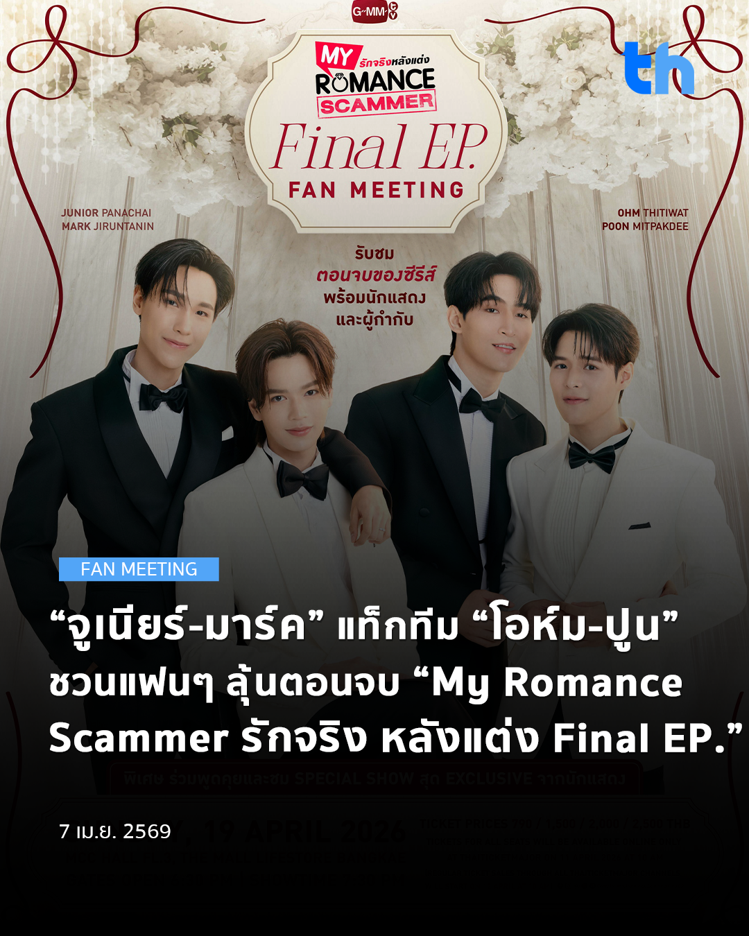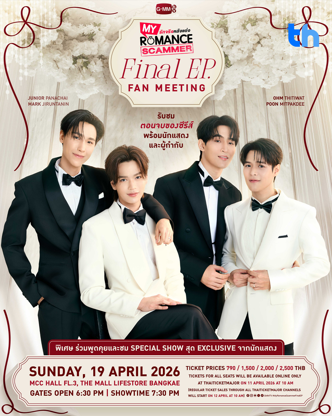 สำหรับผู้ที่สนใจสามารถจองบัตรเข้าร่วมงาน “My Romance Scammer Final EP. FAN MEETING” และติดตามรายละเอียดเพิ่มเติมได้ที่ thaiticketmajor