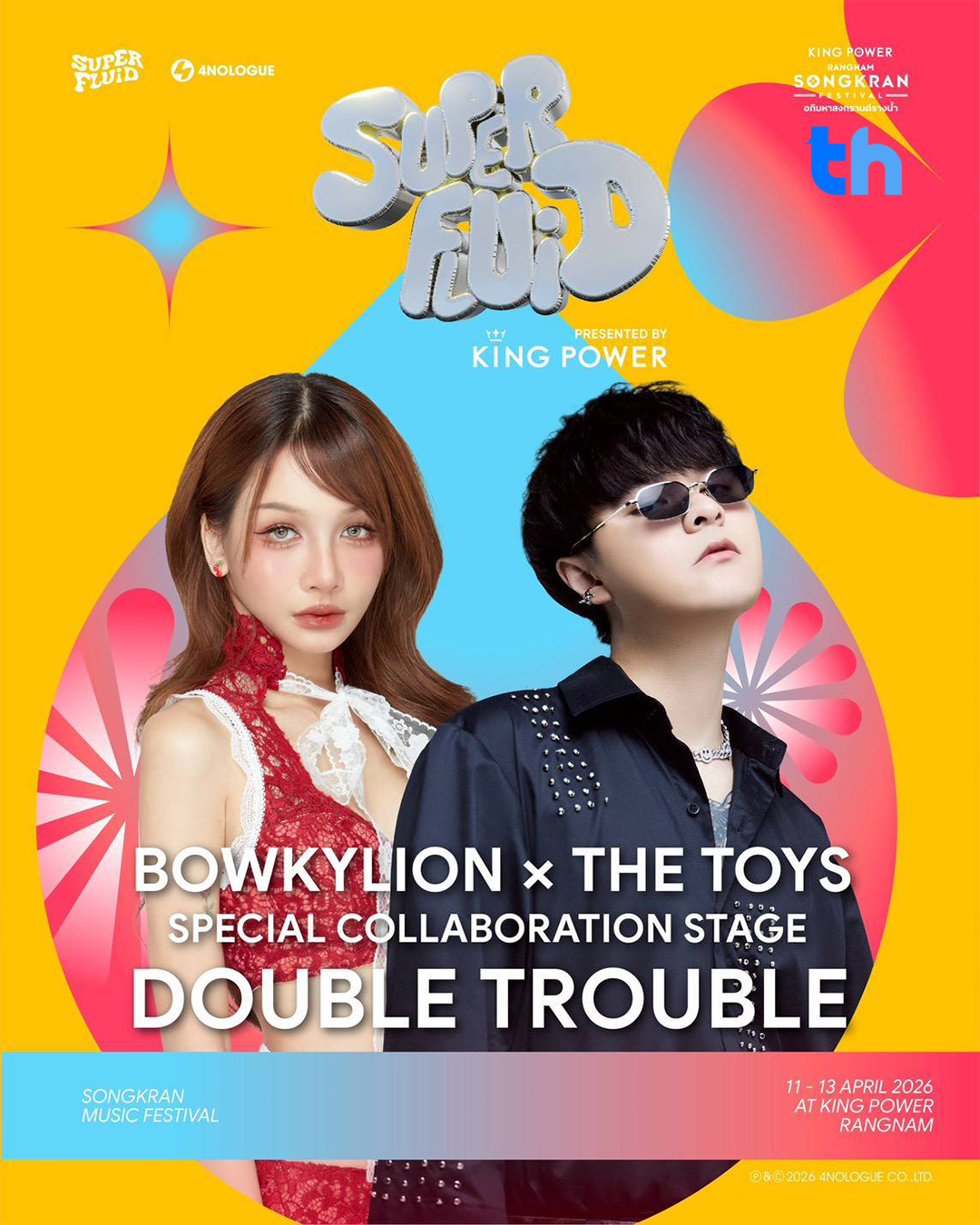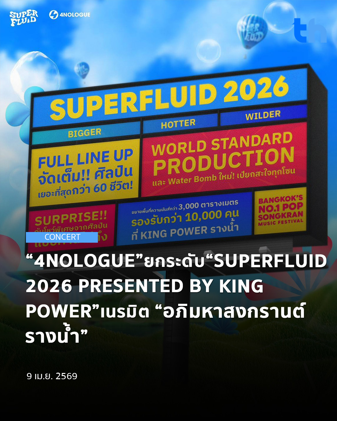 4NOLOGUE เดินหน้ายกระดับเทศกาลสงกรานต์ผ่านงาน “SUPERFLUID 2026 PRESENTED BY KING POWER” ณ คิง เพาเวอร์ รางน้ำ ในงาน “อภิมหาสงกรานต์รางน้ำ THE JOY OF THAI ตะลุยสุข สนุกไทย” ระหว่างวันที่ 9 – 14 เมษายน 2569 ที่พร้อมสร้างประสบการณ์ความสนุกรูปแบบใหม่ใจกลางเมือง ผสานดนตรี ศิลปะ และวัฒนธรรมการเล่นน้ำเข้าไว้ด้วยกันอย่างลงตัวในบรรยากาศสุดคึกคัก โดยเปิดให้เข้าร่วมงานฟรีตลอดช่วงการจัดงาน