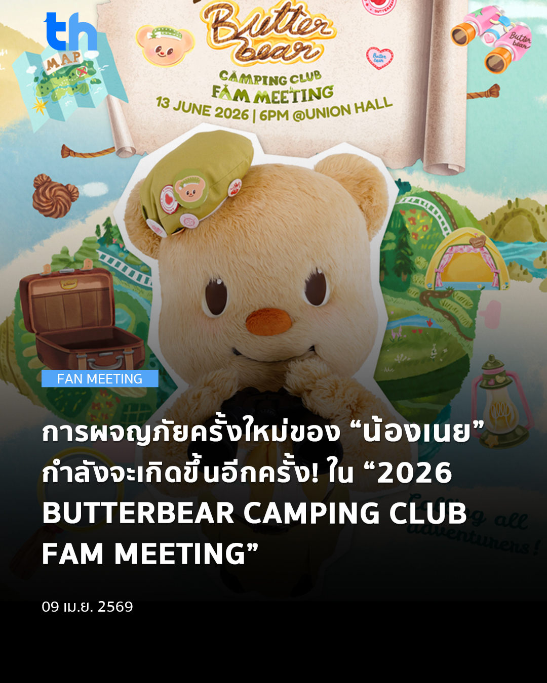 เตรียมออกเดินทางสู่การผจญภัยครั้งใหม่ไปพร้อมกับ “น้องเนย” เมื่อ “Butterbear” ประกาศจัดงานแฟนมีตสุดพิเศษ “2026 BUTTERBEAR CAMPING CLUB FAM MEETING” ที่จะพาแฟน ๆ เข้าสู่บรรยากาศแคมป์ปิ้งแสนอบอุ่น พร้อมกิจกรรมและโมเมนต์ความทรงจำครั้งใหม่ที่ออกแบบมาเพื่อเหล่าแฟนคลับโดยเฉพาะ