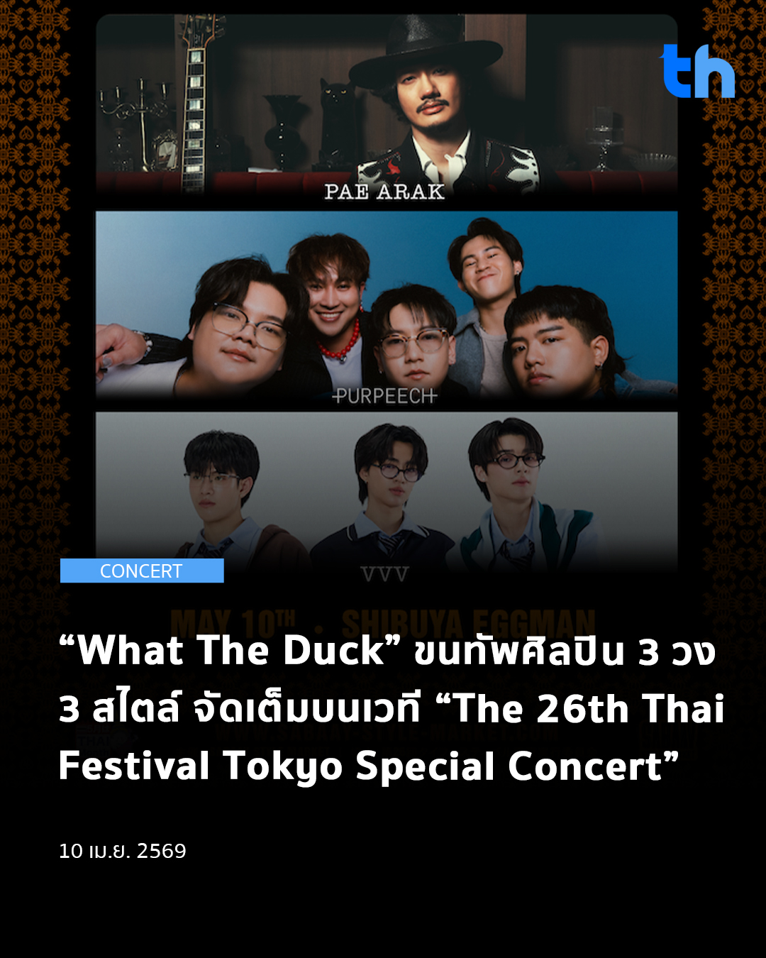“What The Duck” เตรียมบุกเวทีระดับนานาชาติในงาน “The 26th Thai Festival Tokyo Special Concert” วันที่ 10 พฤษภาคม 2569 คอนเสิร์ต Live House ประจำปีซึ่งจัดขึ้นโดย “Sabaay Style Market” ณ Shibuya Eggman เพื่อเป็นการตอกย้ำภาพการเติบโตของอุตสาหกรรมเพลงไทยสู่สากล งานนี้ค่ายเพลง “What The Duck” ไม่พลาด! ขอร่วมเป็นตัวแทนส่งออกศิลปินไปหาแฟนเพลงกันถึงที่