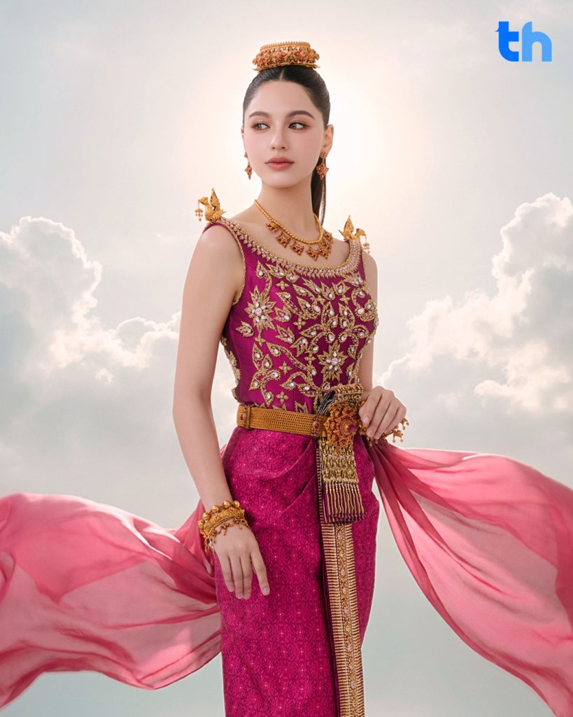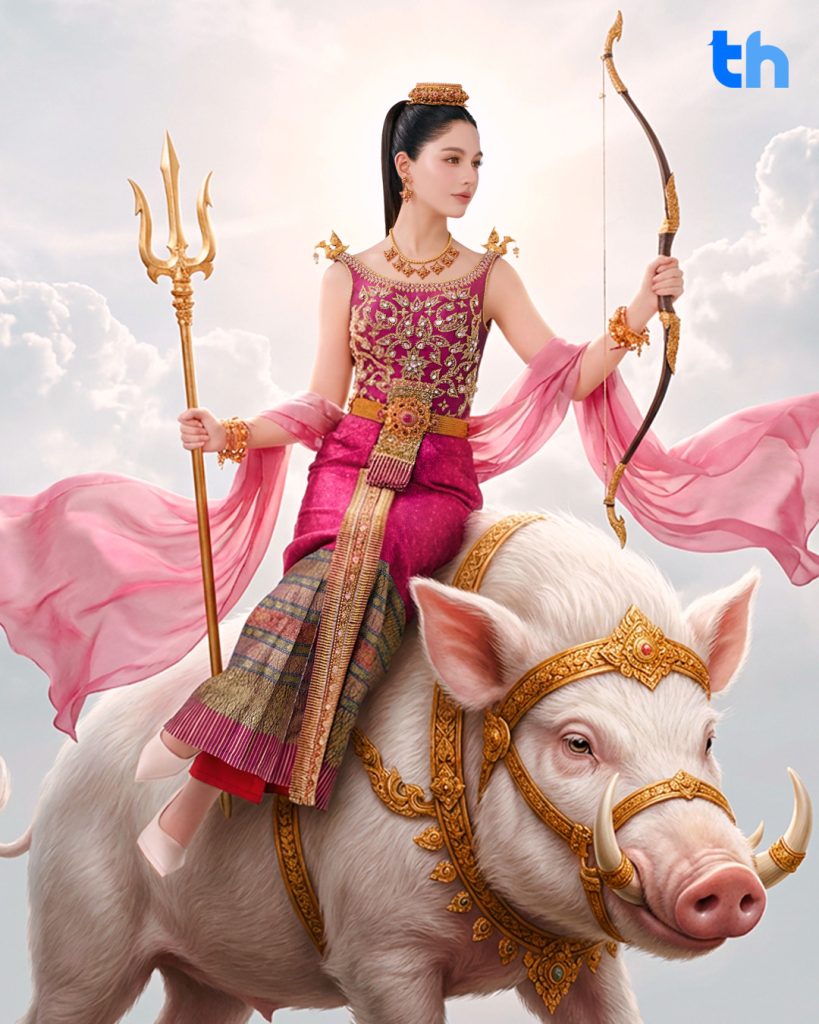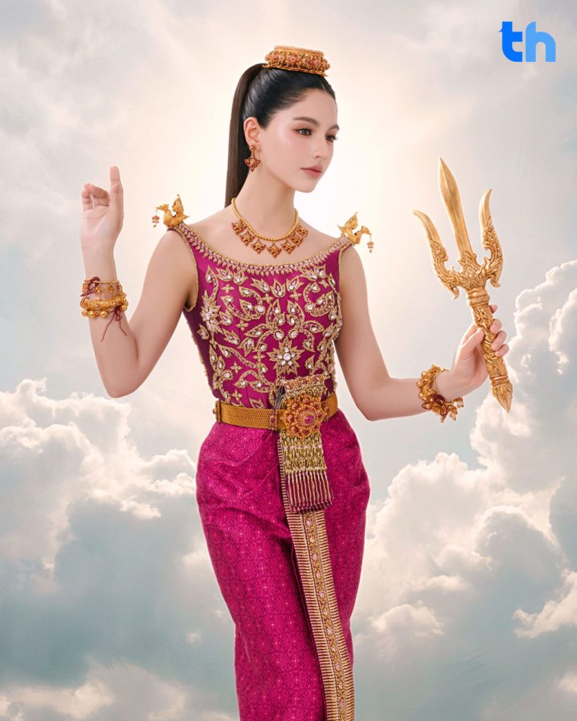 ลุค “นางรากษสเทวี” ของ “เชลลี่” มาพร้อมรายละเอียดที่น่าประทับใจ ไม่ว่าจะเป็นหมูป่าสีชมพูที่อยู่เคียงข้าง มือขวาถือตรีศูล และมือซ้ายถือคันธนู ถ่ายทอดความงดงามราวกับภาพจิตรกรรมไทยที่มีชีวิต สะท้อนเสน่ห์ความเป็นไทยได้อย่างวิจิตรและงดงาม