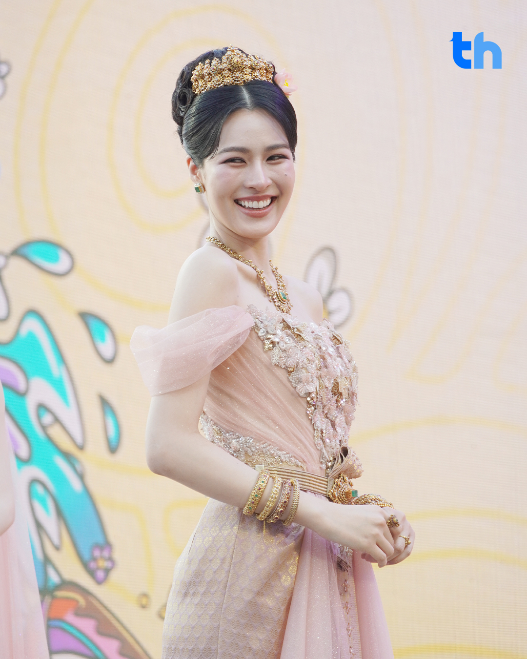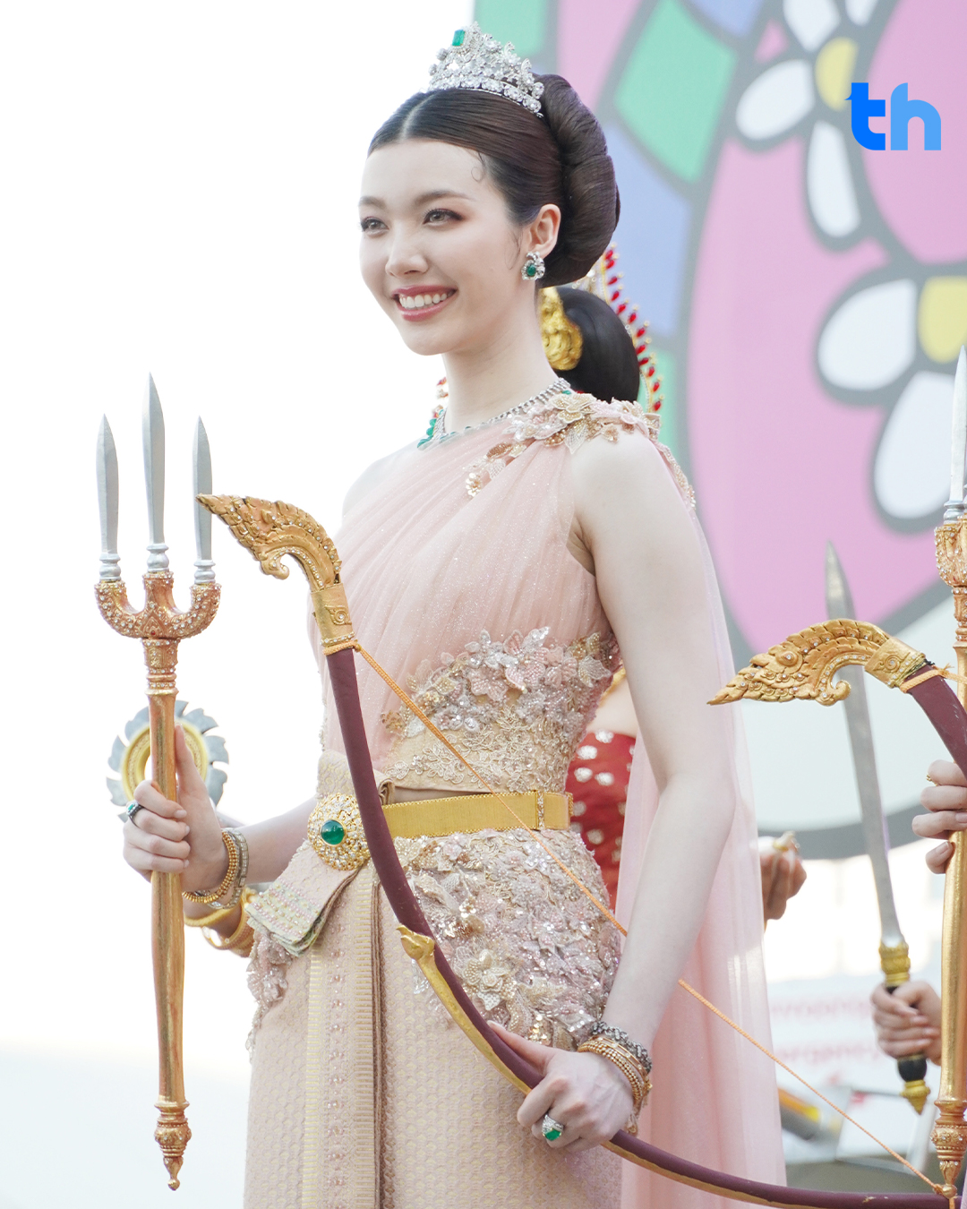 ชุดออกแบบโดย “ครูบิ๊ก พีรมณฑ์ ชมธวัช” แห่งอาภรณ์งามสตูดิโอ ได้แรงบันดาลใจจากชุดไทยพระราชนิยม ปรับโทนสีชมพูอ่อน ผสานผ้าตาข่ายและผ้ายกทองลายโบราณ เช่น ลายกนกเครือเถา สื่อถึงความรุ่งเรืองและการเติบโต เสริมด้วยคริสตัล อัญมณี และงานปักชั้นสูง เพิ่มมิติความงดงามอย่างร่วมสมัย ศิราภรณ์ออกแบบอย่างสง่างามตามแบบราชสำนักไทย พร้อมเครื่องประดับทองคำโบราณหายากของสะสมจาก “คุณโจ๊ก-พุทธพงษ์ เพียรเจริญ” ทำให้ลุคโดยรวมโดดเด่นและวิจิตรตระการตาในขบวนแห่